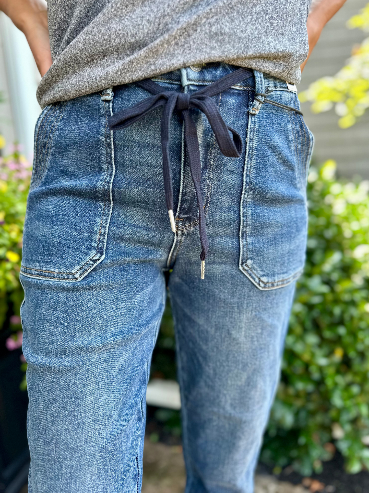 Judy Blue High Waisted Vintage Wash Joggers with Navy Drawstring.