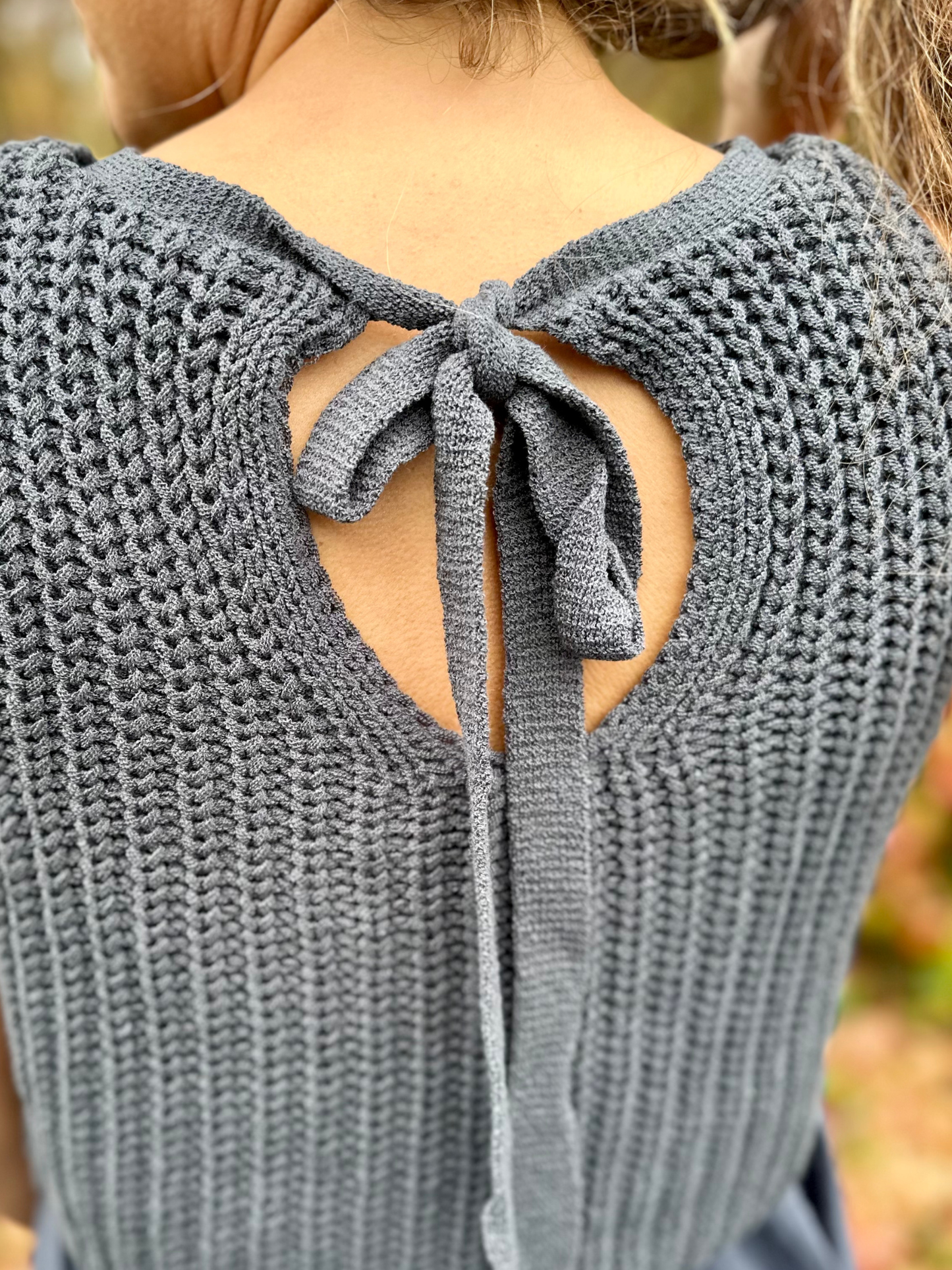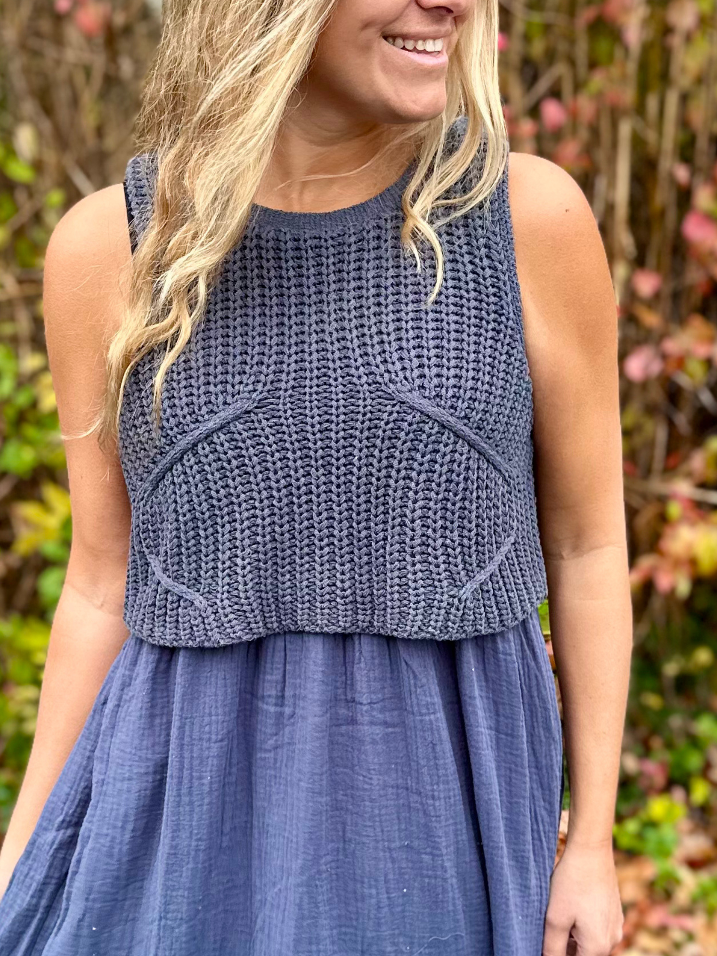 The Braylee Sweater Layered Dress in Navy combines sophisticated layering with modern design details. This sleeveless midi dress features a soft knit blend of acrylic, cotton, and nylon for comfortable all-day wear. The round neckline and flared silhouette create an elegant, flattering shape, while the open back with tie strap detail adds a contemporary edge. Perfect for transitional seasons, this unlined piece works beautifully layered over long sleeves or worn solo for warmer days.