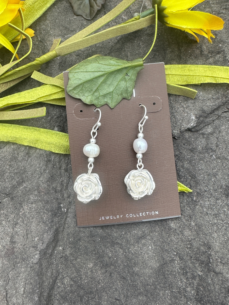 Silver Roses and Faux Pearl Beaded Necklace Set