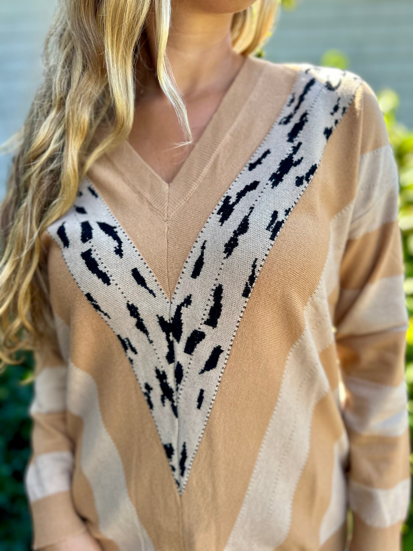 The Hear Me Roar Sweater blends classic tan and camel stripes with a bold animal print accent for a sophisticated yet daring look. Crafted for comfort and style, this sweater offers a versatile layering option that elevates any wardrobe with subtle texture and pattern contrast. Ideal for those seeking a refined statement piece that balances timeless neutrals with a modern edge.