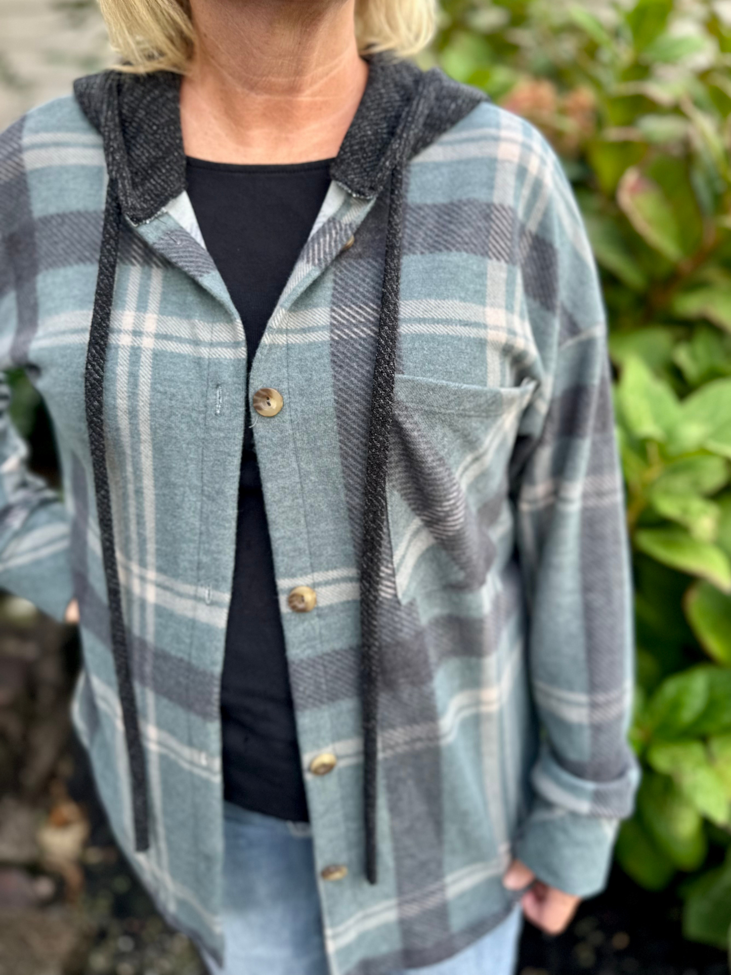 Plaid Button Down Hooded Shacket in Jade Black.