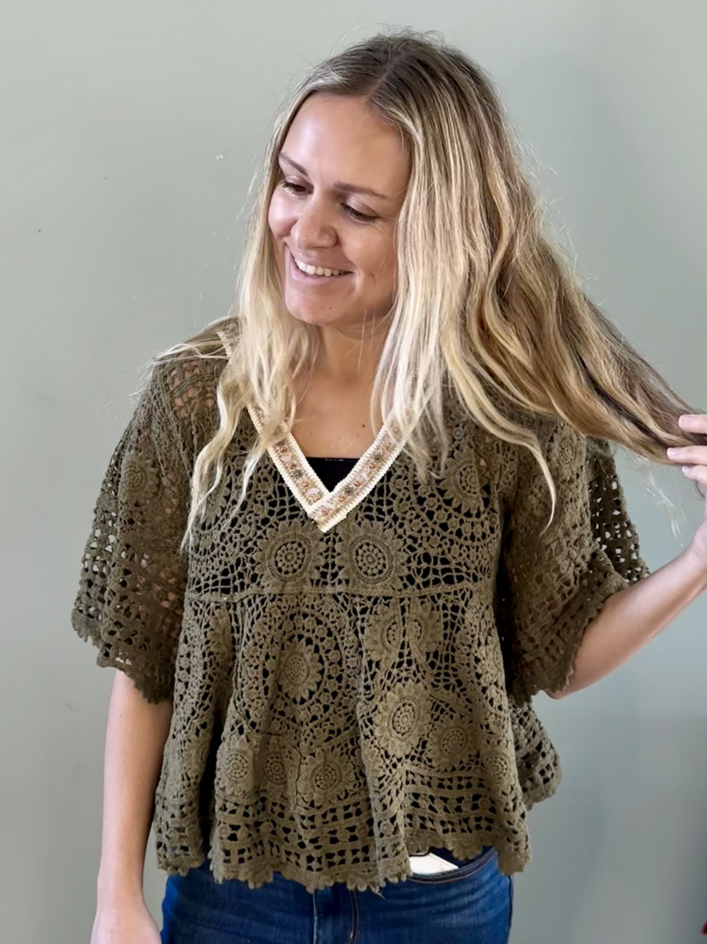 Boho Crochet Blouse in Olive.