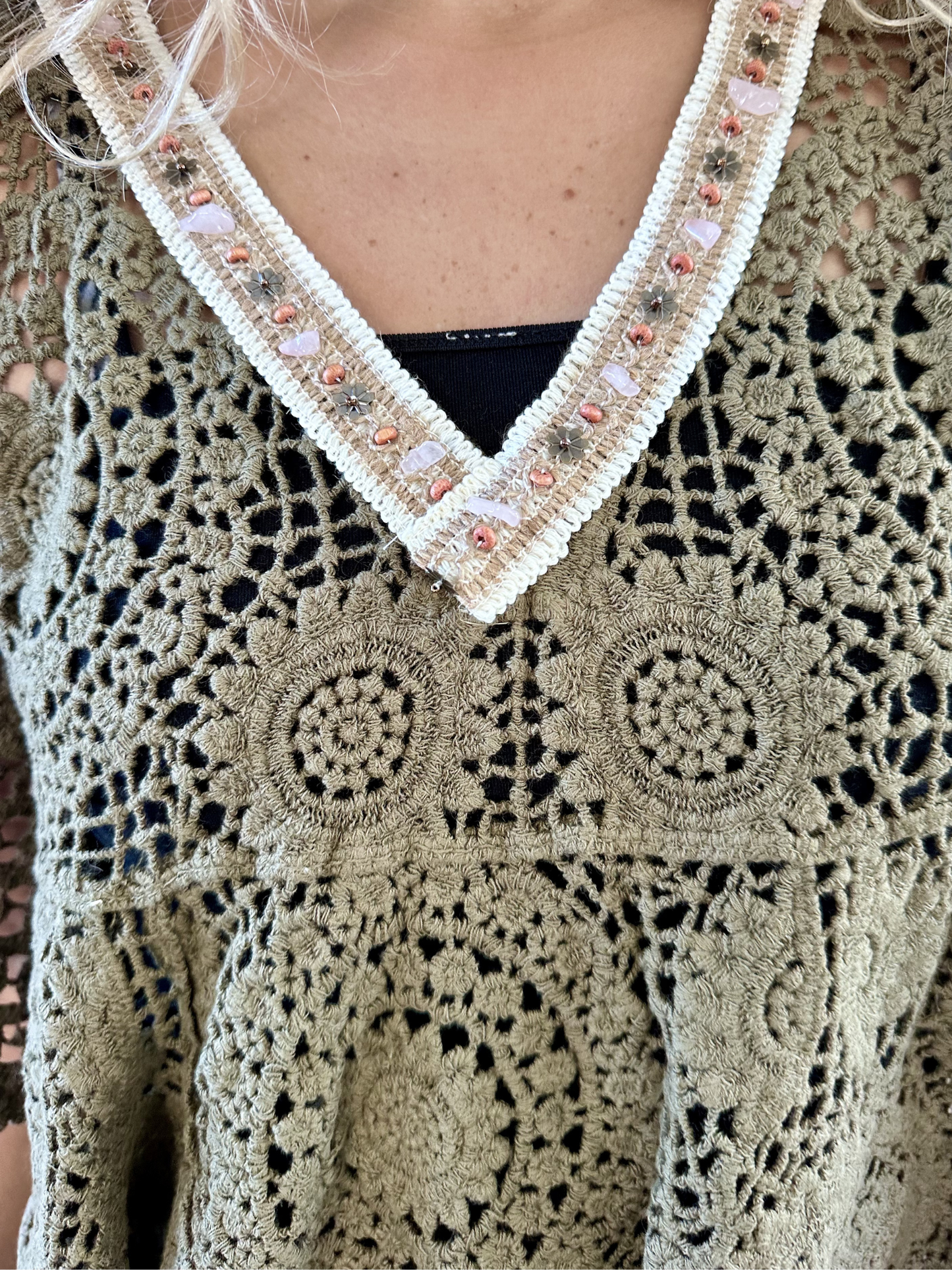 Elevate your wardrobe with this artisanal Boho Crochet Blouse in Olive. Handcrafted with intricate floral lacework and a scalloped hemline, this piece showcases layered crochet panels that create sophisticated texture and movement. The relaxed, boxy silhouette pairs a deep V-neckline adorned with delicate hand-applied beads and contrast trim, while wide elbow-length sleeves deliver breathable comfort. Perfect for layering or wearing solo, the open-weave construction offers an effortlessly chic aesthetic that transitions seamlessly from day to evening.