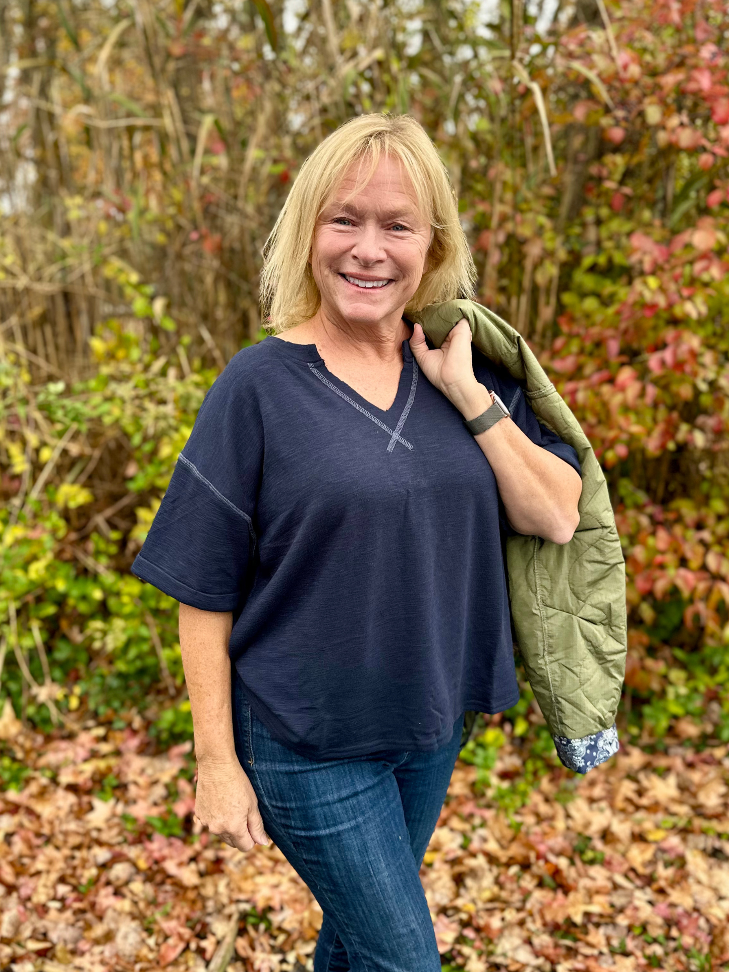 Contrast Stitch Drop Shoulder Knit Top in Navy
