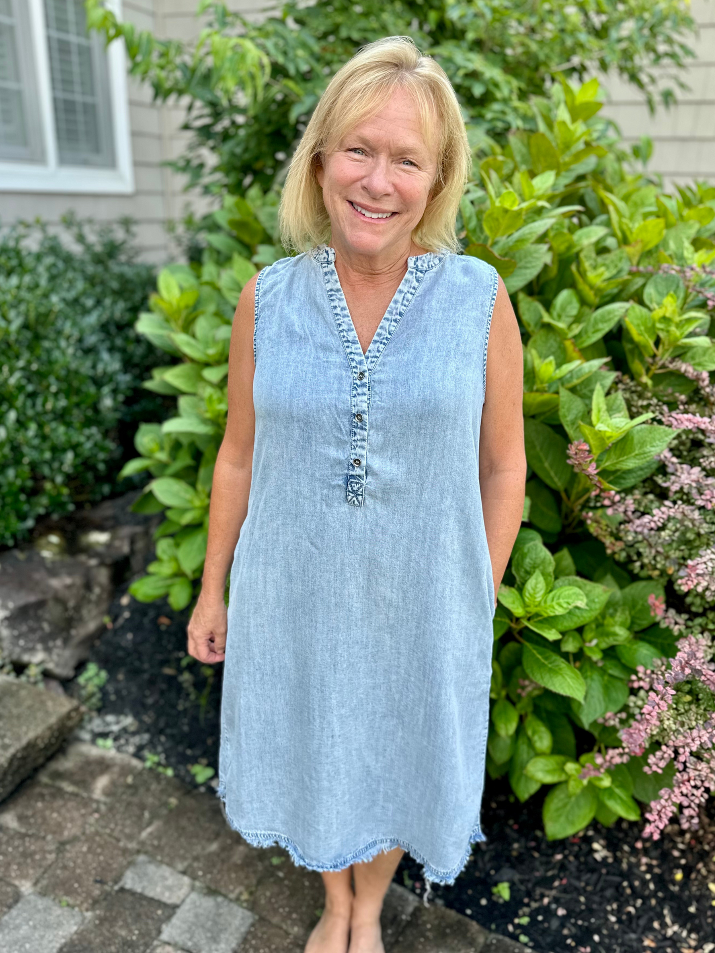 This knee-length denim dress combines casual style with practical design. Its sleeveless cut ensures comfort and freedom of movement, while the classic Henley neckline with button placket adds subtle detail. Convenient side pockets enhance functionality, making this midi dress an ideal choice for effortless everyday wear.