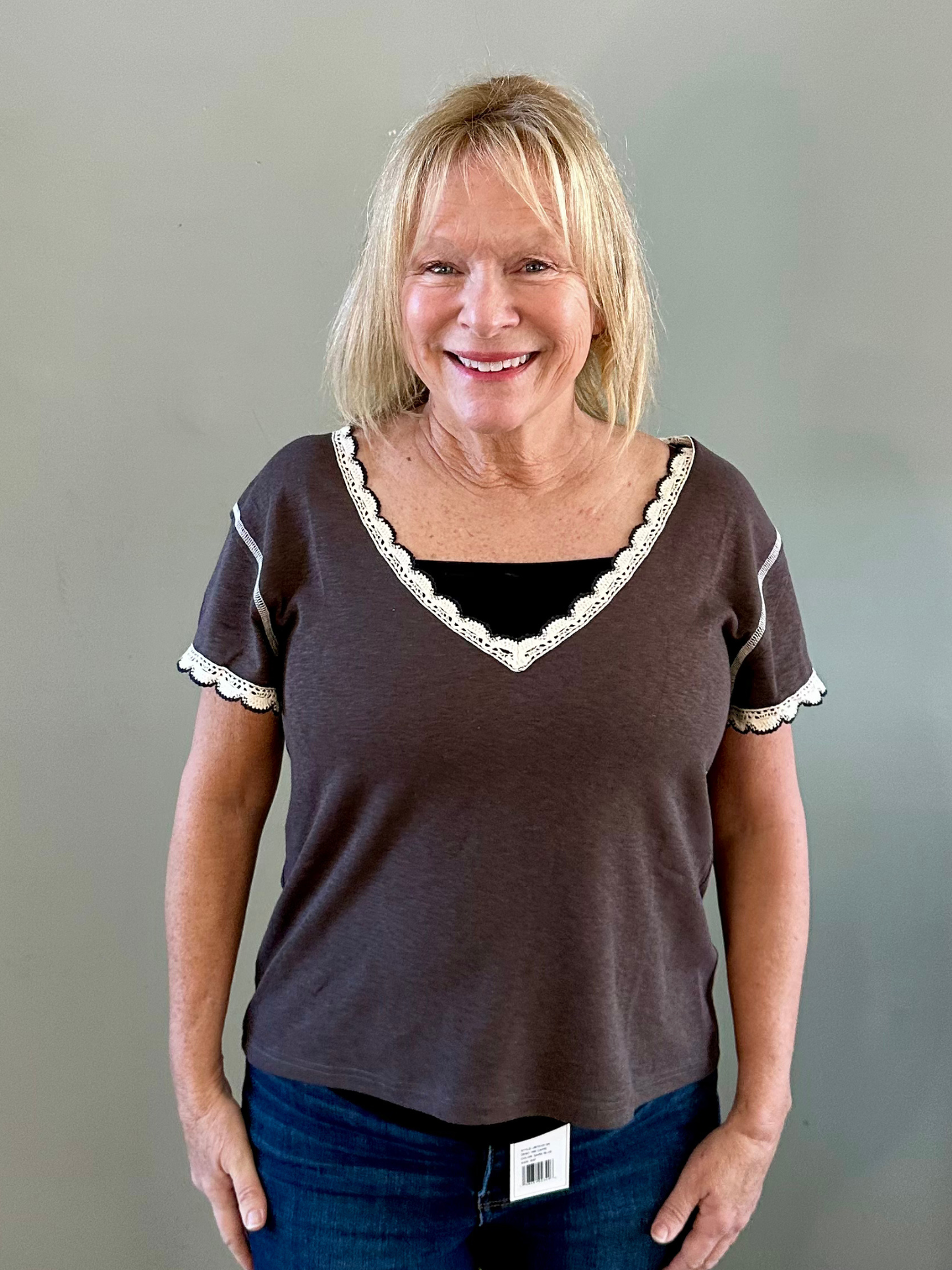 Elevate your everyday wardrobe with this versatile V-Neck Detail Top in Charcoal. Crafted from soft cotton jersey, this short-sleeve essential features a flattering regular fit and refined trim point detailing at the neckline. The vintage wash adds subtle character and depth, while the neutral charcoal hue pairs effortlessly with denim, trousers, or layered pieces. Perfect for transitional seasons and styled for both casual outings and relaxed office settings.